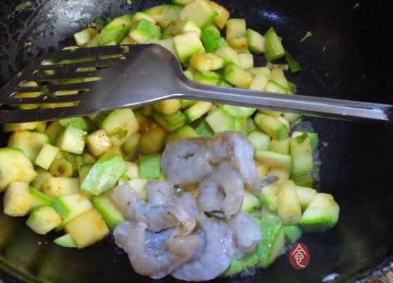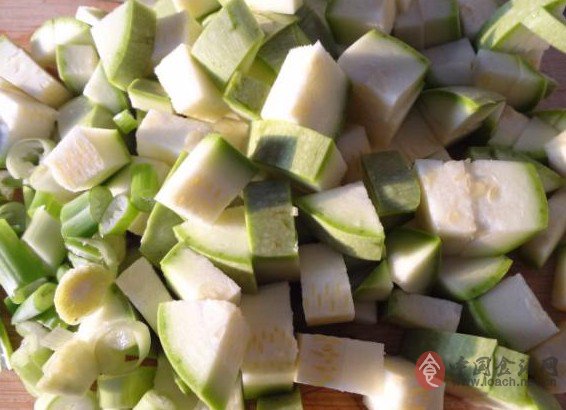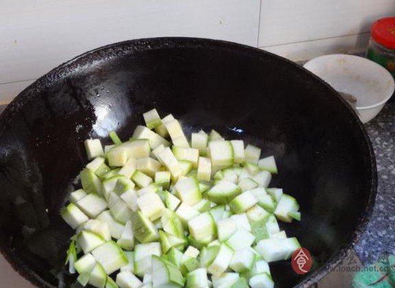 5、锅留油,花椒粉爆锅、下入西葫芦丁,烹料酒、点少许生抽,加盐(火力中点,以免糊锅)