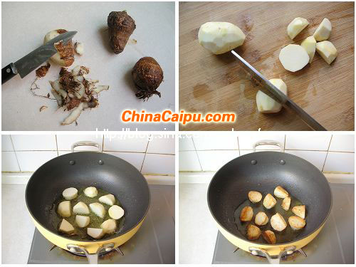 1、芋头削去外皮,切块后洗净,放入油锅中以小火炸至外皮金黄色,捞出沥干油份备用。