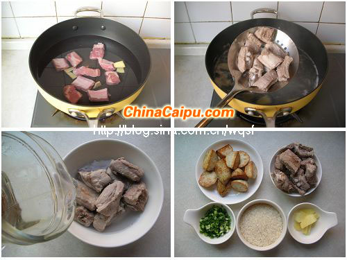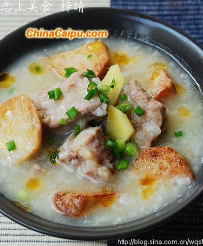 材料:粳米60克、排骨200克、芋头150克、生姜一块、小葱2根