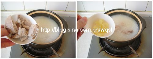 3、锅中的水煮开后放入洗净的粳米,转小火煮20分钟,再放入焯过水的排骨和姜片继续煮30分钟后,