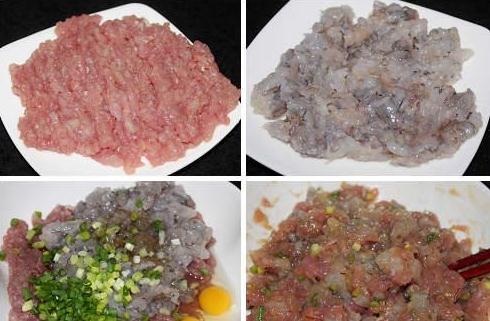 所用原料:猪里脊、虾仁、大馄饨皮、鹌鹑蛋、小葱等