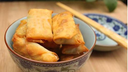 4、锅里放适量油,5成热时,转中火,码入包好的春卷,正反面煎下,色成金黄色时捞出,用厨房纸巾吸下油即可