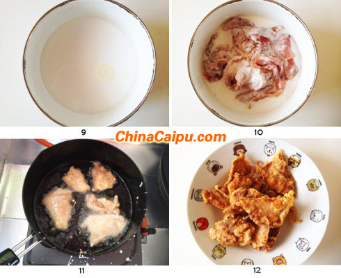 11.锅中放油加热至6、7成热,加入肉片,两面炸成淡黄色后捞出来。