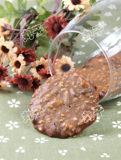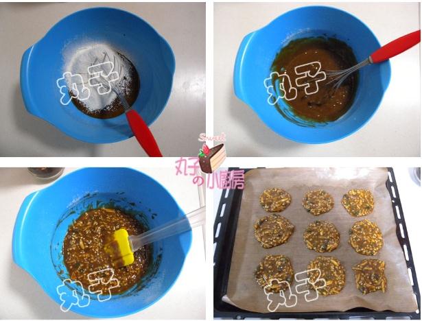 原材料:糖粉60g;黄油40g;牛奶1大匙;蛋白25g;咖啡粉3小匙;低筋面粉30g;杏仁角、杏仁碎、开心果一共75g。