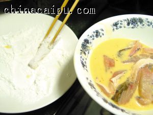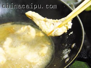 5 烧热1碗油,放入鱼块炸至呈金黄色,夹起沥干油待用。
