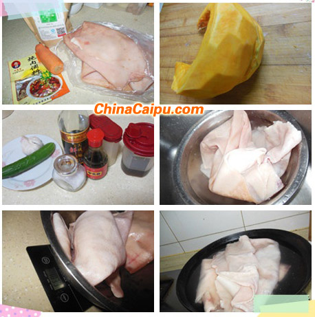 1、材料:猪肉皮800克,清水2400克(肉皮和水的比例1:4),胡萝卜1根,花椒、小茴香、葱、姜等(不要用下色深的调味料以免影响肉冻色泽)。