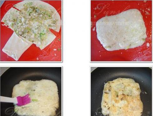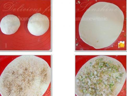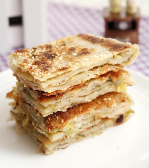 12、面饼一面变色后,翻面,同样,在朝上的一面刷上葱油,翻个四次就差不多了。
