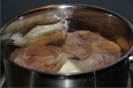 2,取用大锅放入牛腿,加满水,下原料2(我放在茶叶滤袋里面了。滤袋一欧元一百个,经济实惠,非常耐用。)、绍酒烧沸,撇去浮沫,改用微火保持沸而不腾,炖3小时至酥。