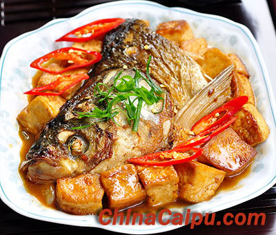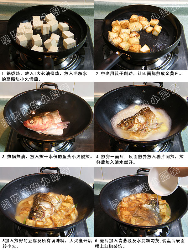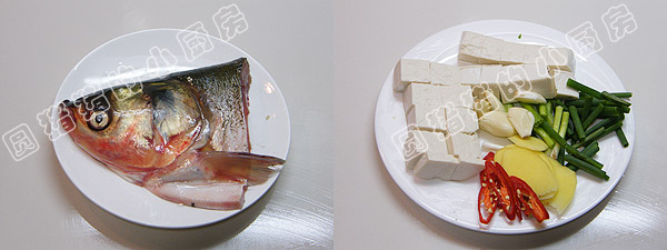 材料:大鱼头400克 南豆腐2块 姜片10克 大蒜5瓣 香葱段5克