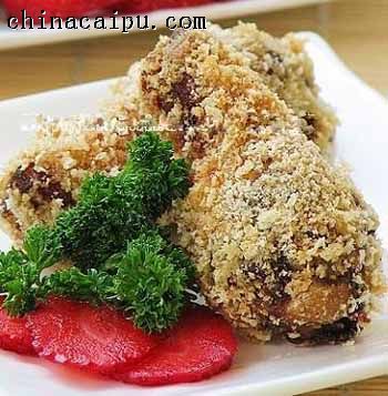 5、将烤至8―9成的翅根依次裹上淀粉、蛋液、面包糠,放入热油中炸至略微焦黄捞出放在厨房纸上吸去多余油份即可。
